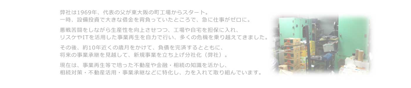 弊社は1969年創立の金属加工業が前身の会社。 1981年からIT化に取り組み、危機的な状況ではITと不動産を活用し、自力での事業再生で乗り越えてきました。